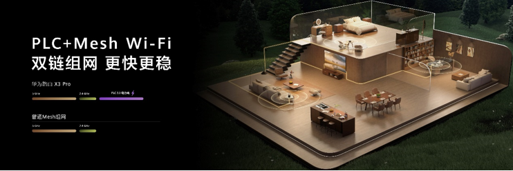 针对大户型、复式房型的网络覆盖痛点,华为路由 X3 Pro带来颠覆性的第三代PLC千兆组网。无需额外布线,仅利用家中现有电线即可传输网络信号,让家中的电线秒变高速网线。此外,华为路由 X3 Pro采用PLC+Mesh混合组网方案,核心优势全面升级。