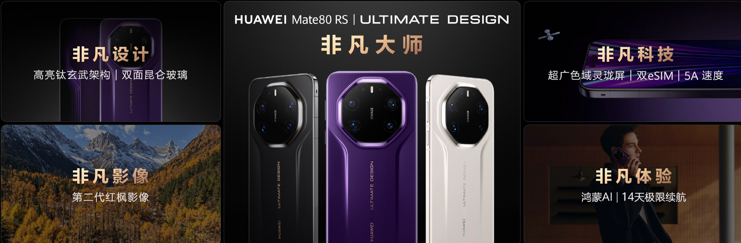 全新HUAWEI Mate 80 RS 非凡大师采用玄武架构、第三代玄武钢化昆仑玻璃以及第二代玄武镀膜,集高级质感与耐用性于一身,同时带来皓白、玄黑、槿紫三种色配色选择;首发搭载BT.2020超广色域灵珑屏,带来更沉浸更真实绚丽的画面体验;采用全新高低频双振膜立体声单元,打造超乎想象的视听体验。