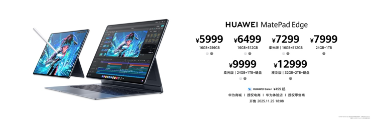 售价方面,华为MatePad Edge售价5999元起,于2025年11月25日18:08在华为商城、授权电商、华为体验店和授权零售商同步上市。华为星跃悬浮键盘售价1499元,2025年11月25日同步开售。华为星跃随行键盘售价999元,将于2025年12月12日开售。