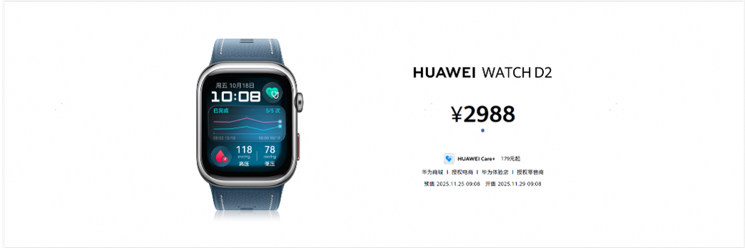目前,HUAWEI WATCH D2已全面开启预售,2025年11月28日正式开售,售价2988元。