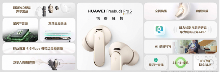 华为FreeBuds Pro 5悦彰耳机采用全新悦彰星环设计,提供四款配色,它是业界首款支持星闪™[8]音频技术的无线耳机,其搭载华为自研第三代音频芯片,配合L2HC 5.0协议,最高传输速率可达4.6Mbps,可聆听96kHz/24bit母带级无损音源。耳机同时是全球首款双擎AI感知降噪耳机,采用业界首个双单元双路主动降噪架构,降噪效果最高提升至220%。华为FreeBuds Pro 5用户在“华为创新研究APP”加入听力检测与助听研究[9]后,耳机可居家进行听力检测并为中轻度听损用户提供听力补偿。同时,FreeBuds Pro 5新增AI录音转写功能[10],支持实时转写并生成摘要、待办事项。