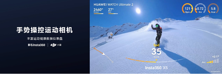 HUAWEI WATCH Ultimate 2 非凡探索还能与三方相机(影石Insta360、大疆DJI)实现互联,让户外运动更便捷有趣。已支持多款全景相机、拇指相机、运动相机通过手表app进行互联,并通过手表手势操控轻松控制拍摄。其中,影石Insta360为华为穿戴用户打造了首款定制仪表盘,心率、速度、位置等数据可嵌入视频画面,让运动体验记录更丰富。