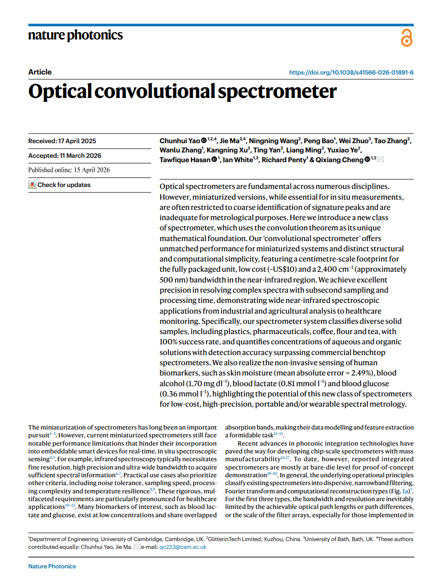 近日,一个来自中国的团队——徐州光引科技发展有限公司与剑桥大学团队联合宣布,成功研制出一种名为“光学卷积光谱仪”(Optical Convolutional Spectrometer)的面向量产的革命性片上光谱系统,革新了智能终端的交互逻辑。不仅解决了微型光谱仪性能、体积与成本的“不可能三角”难题,还让可穿戴设备从“记录型电子产品”升级为真正意义上的“个性化智能健康管家”成为可能。这项突破性成果已发表于国际顶级期刊《自然·光子学》(Nature Photonics)。