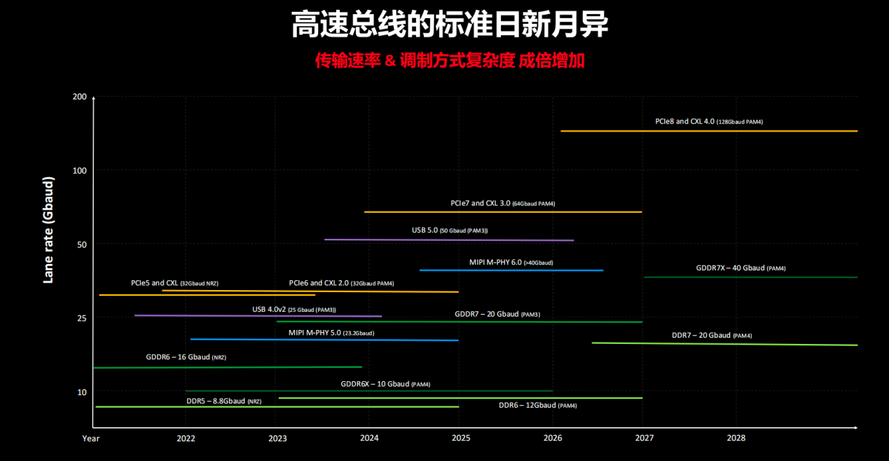 “从产业演进来看,高速互联技术正进入一个明显的加速周期。SerDes速率从24G迈向48G,以太网正向1.6T乃至3.2T升级,PCIe也在持续推进至6.0、7.0等更高代际。”是德科技行业市场经理阳任平分析道,更关键的是,单纯提升频率和速率已经不够。随着PCB、连接器和高速Cable逐渐逼近物理极限,行业开始更多依赖调制方式升级来提升单位时间的信息承载量。过去从NRZ向PAM演进,正是这一逻辑的体现。