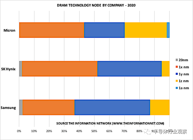 根据Information Network的报告,截至2019年9月,美光9%的DRAM采用20nm制程,在1y-nm节点上,美光的产量占15%,略低于SK海力士,但领先于三星。而该公司量产的DRAM中有6%采用了最先进的1z-nm制程工艺。
