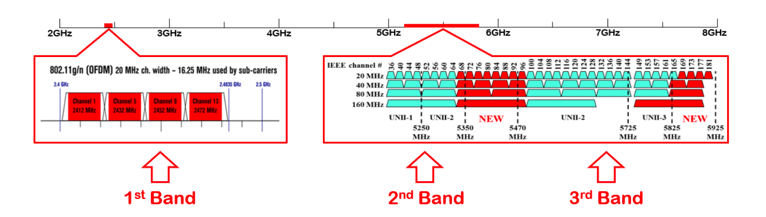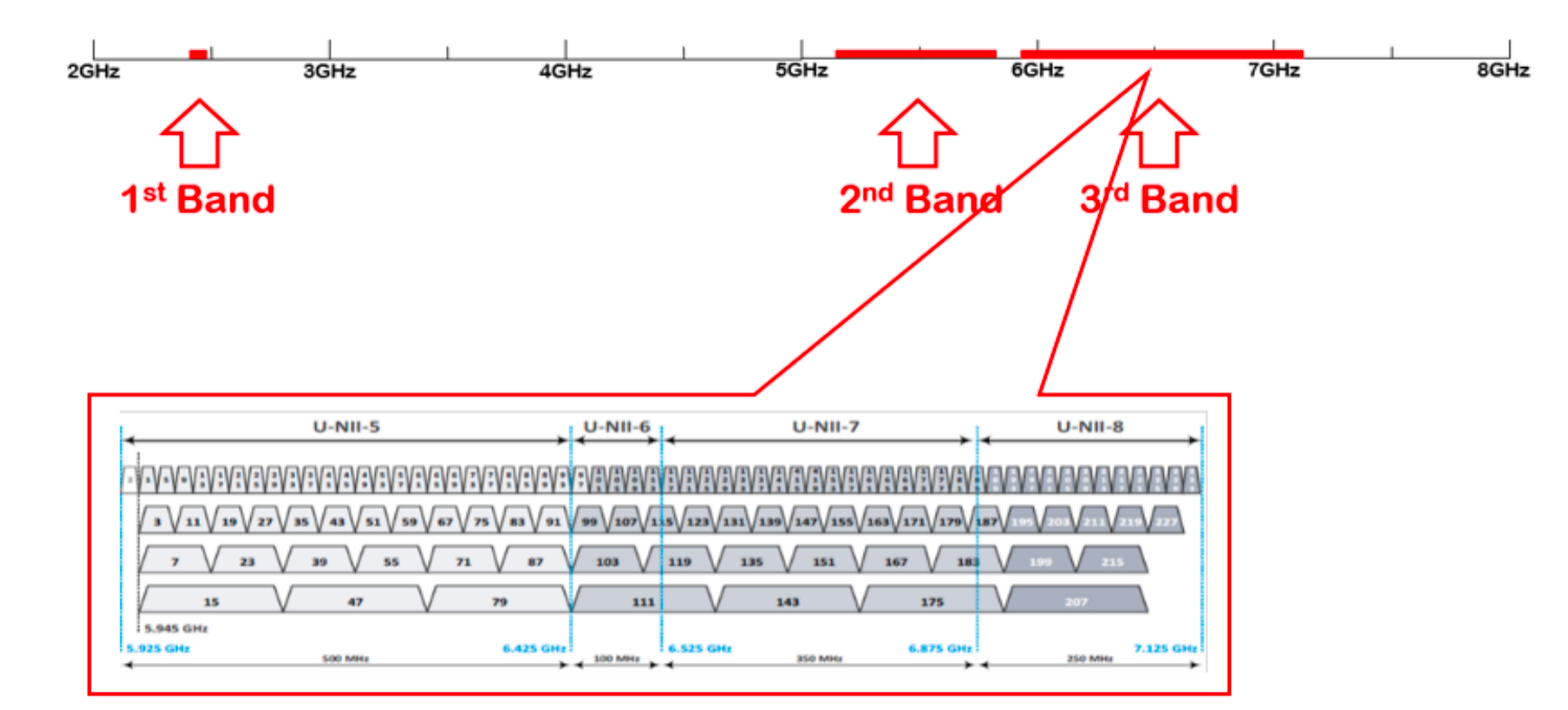 在Wi-Fi 6E之前,所谓的“三频”是通过将5GHz频段(U-NII1-U-NII3,即5150MHz-5835MHz)划分为两个子频段实现的,这两个子频段分别是U-NII1–2a(5150MHz-5350MHz)和U-NII 2c–3(5470MHz-5835MHz),如图2所示。