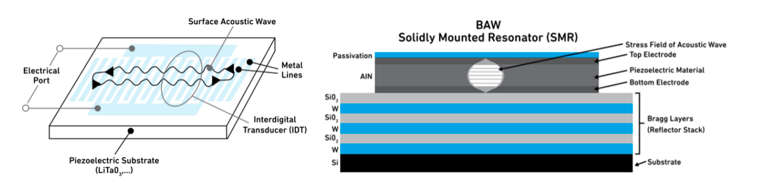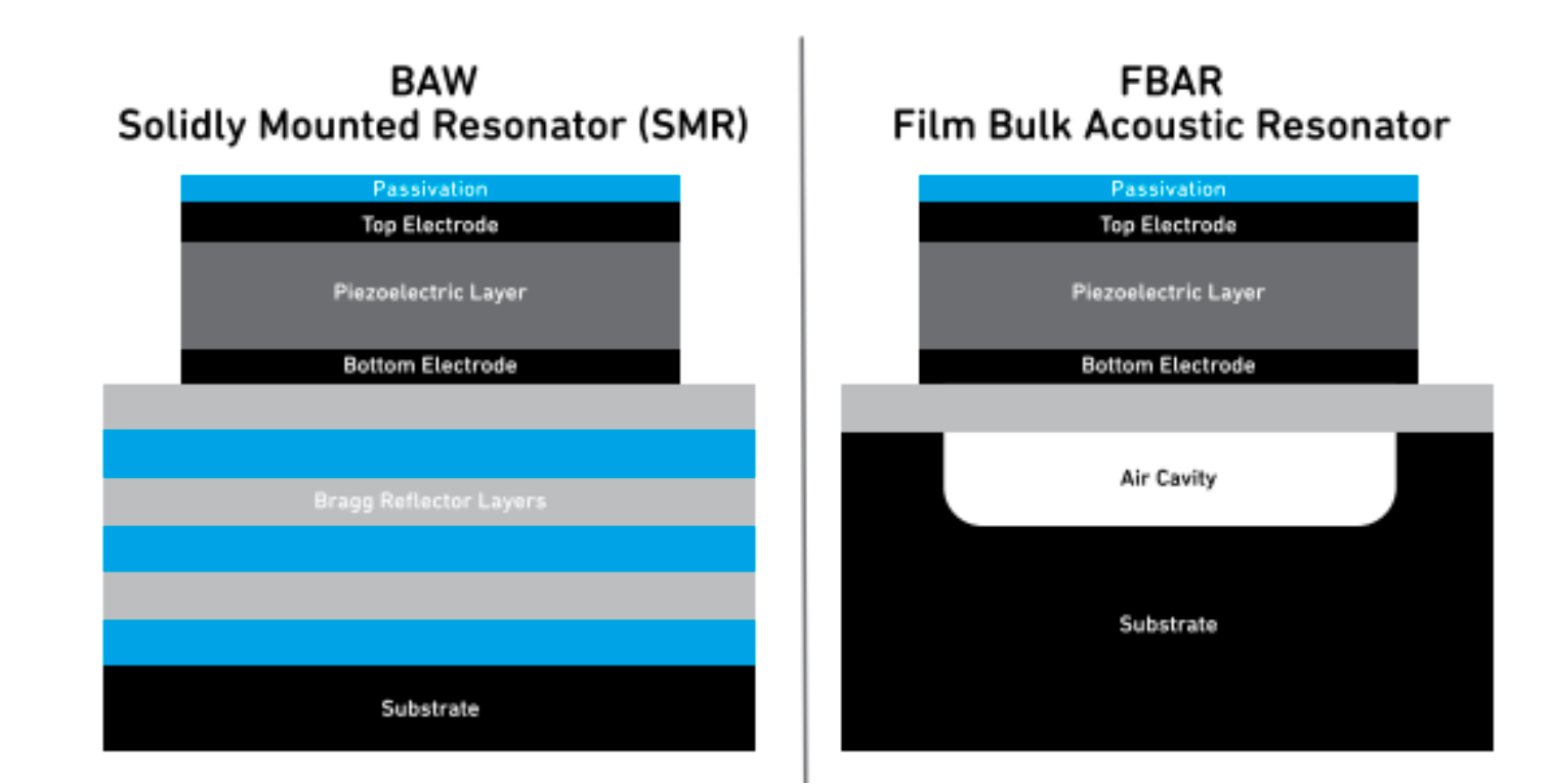 · 薄膜体声波谐振器(FBAR)滤波器:FBAR滤波器是一种由压电材料构成的器件。该压电材料在两个导电(通常是金属)电极之间通过薄膜形成一个腔体,再基于电极之间的压电层的压电性形成谐振器,以达成滤波的目的。FBAR谐振器属于体声波谐振器(BAW)和压电谐振器的类别,用于需要高频率、小尺寸和小重量的应用设计。
