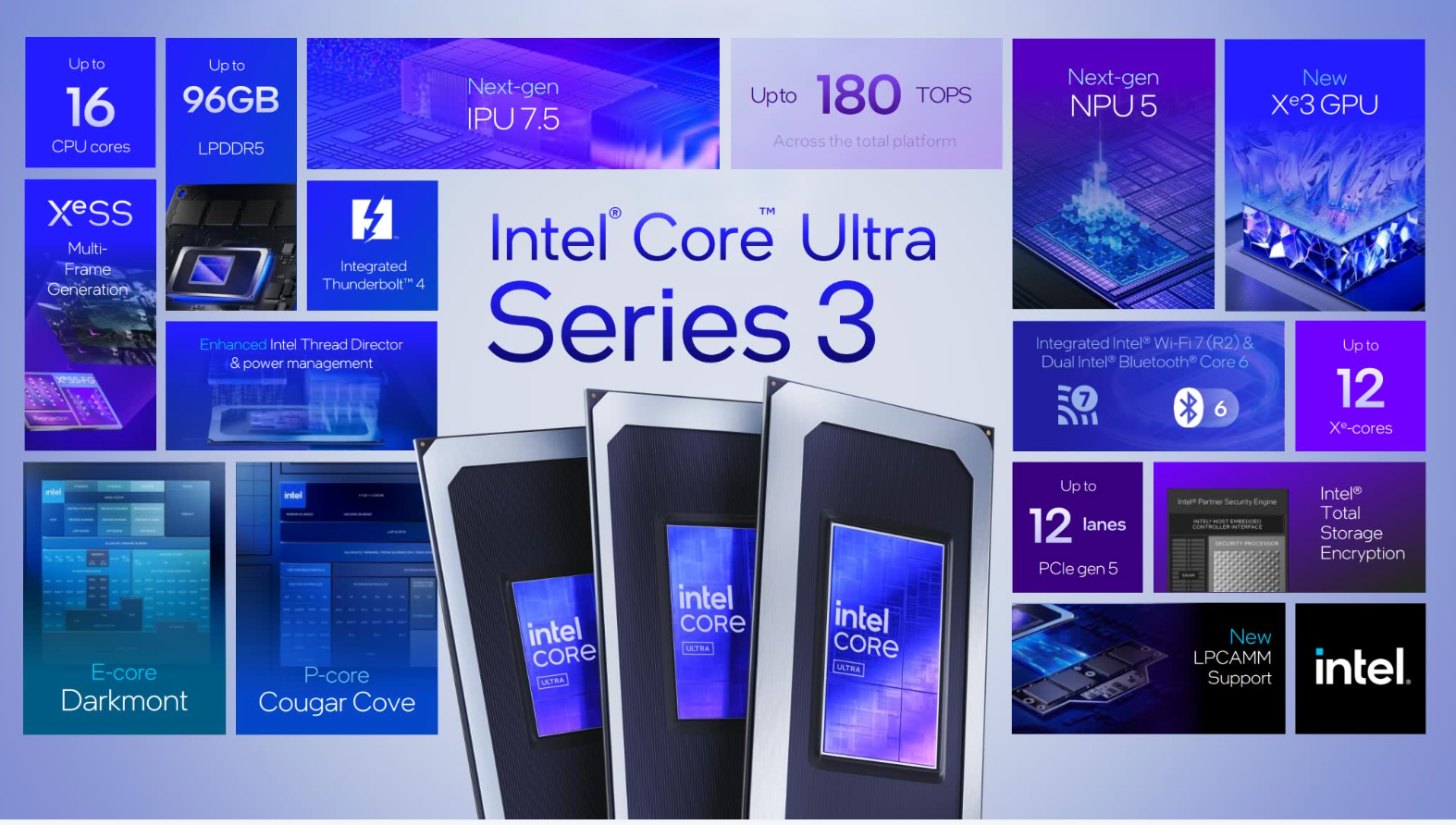 作为英特尔移动平台的最新巅峰之作,第三代英特尔酷睿 Ultra 处理器Panther Lake通过架构与工艺的全面迭代,实现了性能与能效的指数级跃升。在 AI PC 趋势下,CPU 已不再是唯一主角,系统级能力(AI、图形、连接、平台功耗)开始成为决定体验的关键。