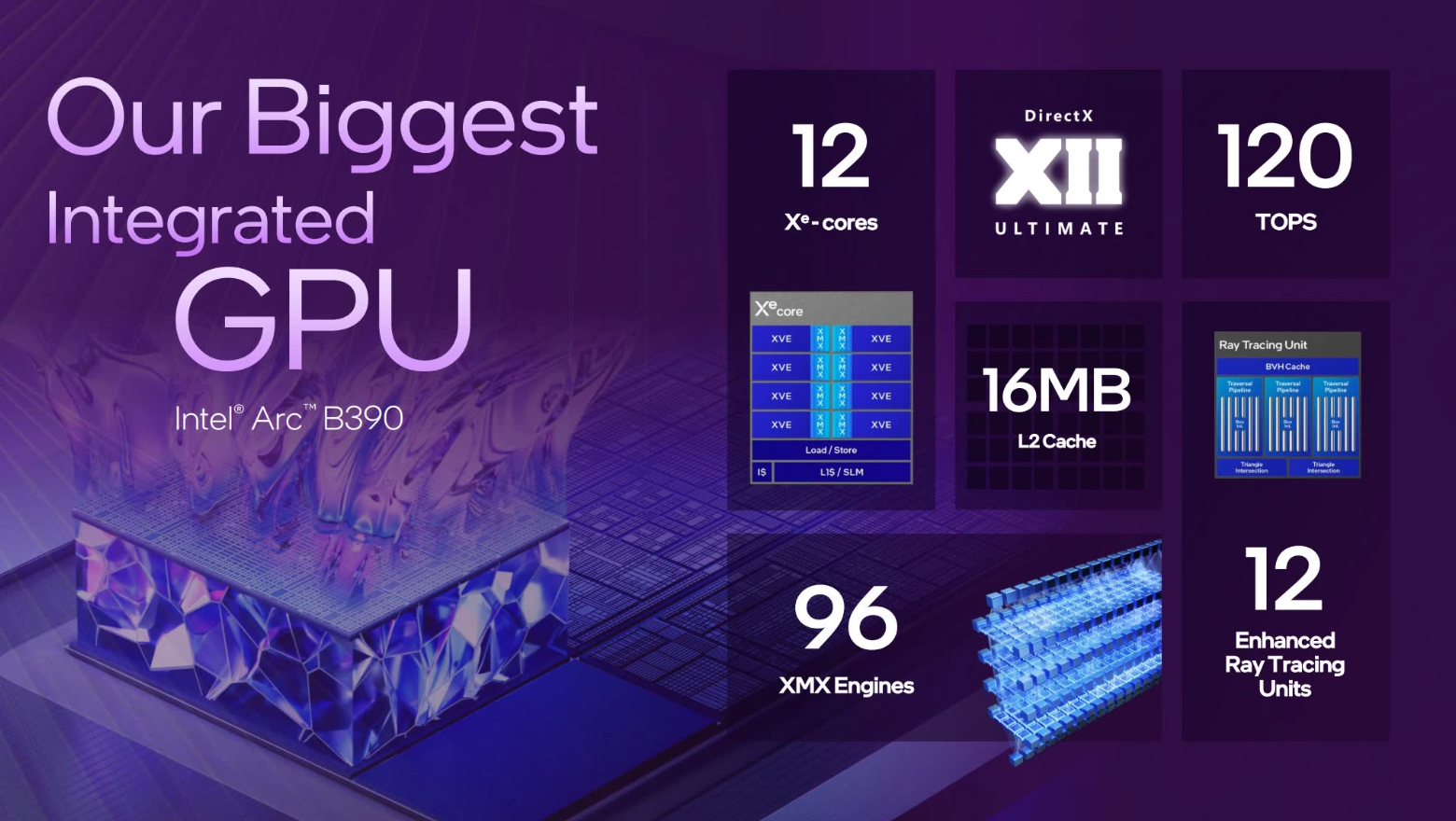 在图形领域,Panther Lake 实现了从架构到性能的跨越式革新,正式引入了代号为 B390 的顶级 Xe3 架构内置显卡。这一命名规则的改变,标志着其核显性能已足以媲美主流独立显卡。