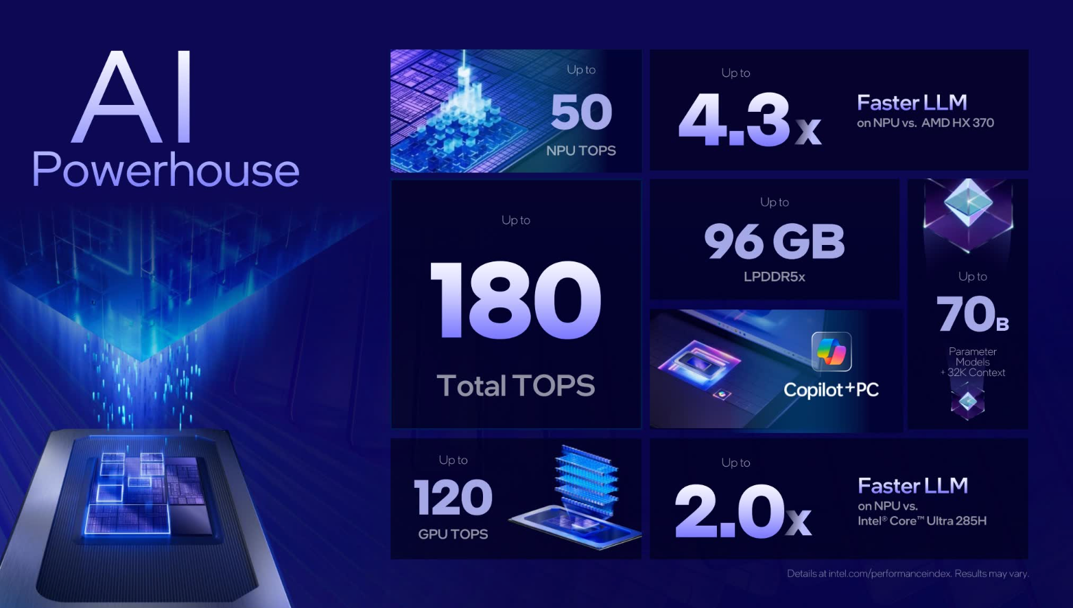 而以上所有体验均植根于英特尔领先的芯片技术。随着第三代产品Panther Lake的推出,AI PC的能力将再上一个很大的台阶。在硬件规格上,Panther Lake 实现了总算力高达 180 TOPS 的跨代飞跃。凭借 120 TOPS 的 XMX GPU 算力、50 TOPS 的第五代 NPU 以及最高 96GB 大内存的支持,该平台刷新了端侧 AI 的上限——它是目前行业内极少数能本地运行 700 亿(70B)参数大模型并处理 32K 上下文长度的 SoC。实测数据显示,Panther Lake 的 NPU 大语言模型推理性能较上代提升 2 倍,相比竞品优势高达 4.3 倍;在 AI 创作与 Int8 量化场景下,其 GPU 性能表现更是达到同类产品的数倍。这种全方位的算力领先,确保了从视频会议降噪等持续性任务到复杂大模型推理的高效执行。