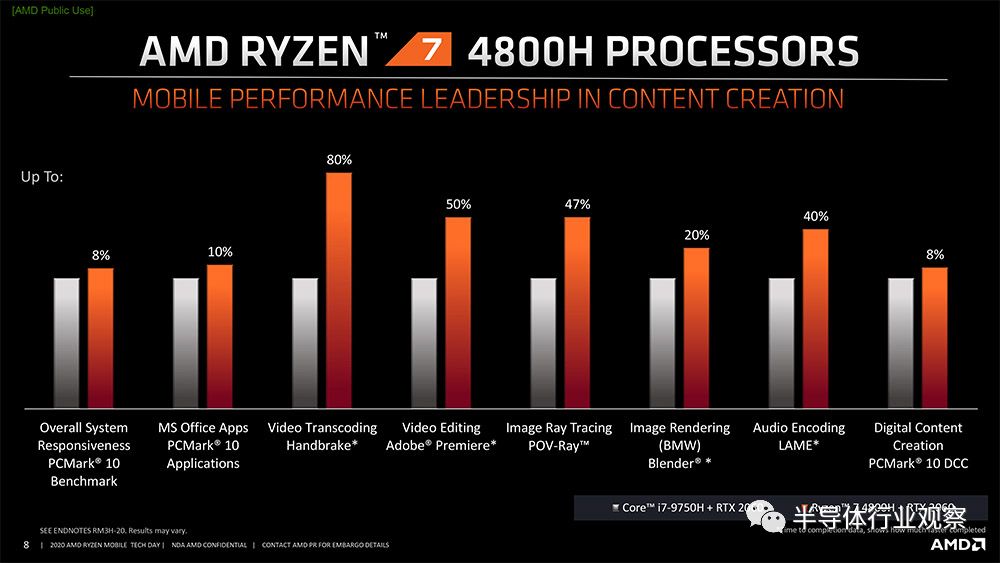 4800H 对上i7-9750H 同样搭配独显RTX 2060 芯片,在整体效能PCMark 10 测试,4800H 有着8% 领先、Office 应用有10% 提升、影片转档(Handbrake)则有80% 飙升、Premiere 则有50 % 提升,光线追踪V-Ray 有着47% 提升、渲染Blender 20%。