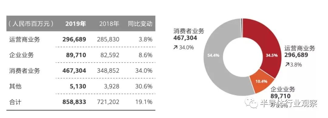 在运营结构方面,与2018年消费者业务占据半壁江山(45%)相比,华为2019份额继续增加,达到54%,已经超过半数。而在运营商业务方面,虽然占据第二名(34.5%),但增速垫底。同时企业服务方面,与去年增速同比23.8%相比,今年增速放缓,同比增长8.6%。