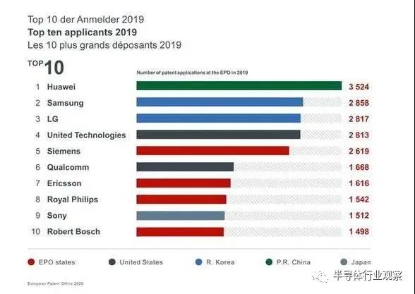 同时根据欧洲专利局的数据显示,华为在2019年以3524件专利申请排名在第一位,以600多件的差距领先了第二名的三星。