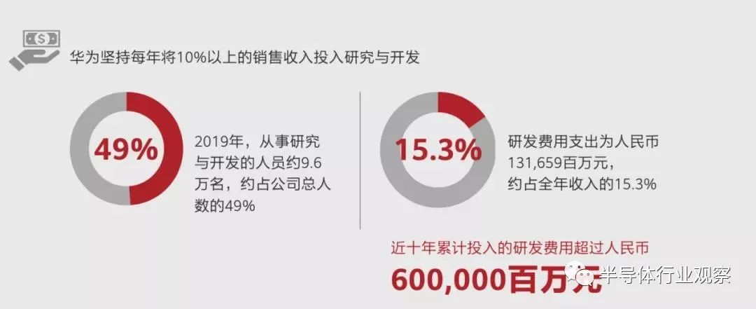年报显示,2019年华为研发费用达1317亿元人民币,占全年销售收入15.3%,近十年投入研发费用总计超过6000亿元人民币。
