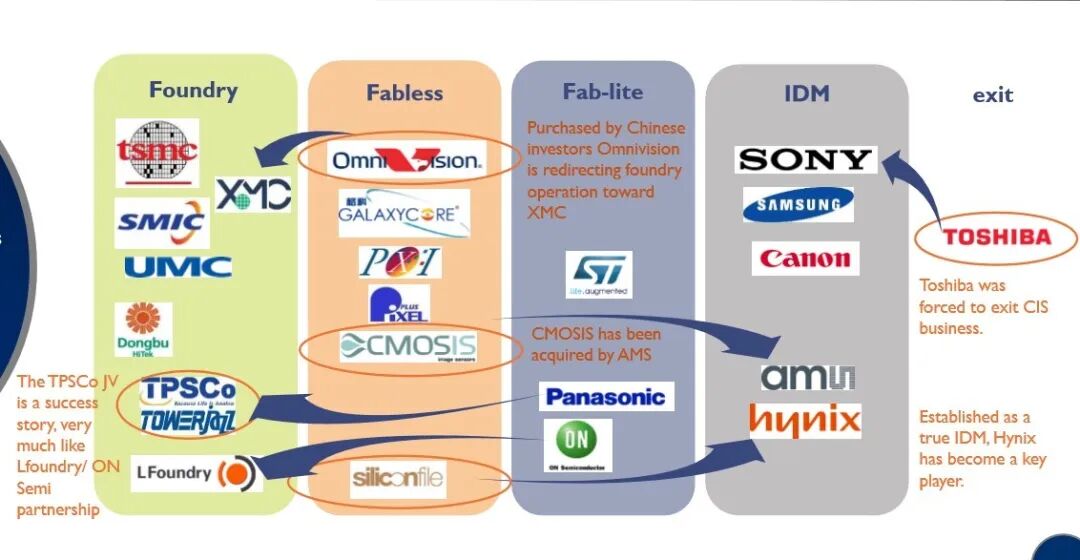 更高的分辨率、更小的像素密度、更小的模组高度、分辨率和成本之间的平衡,使得CIS厂家必须采用BSI、3D Stacked BSI、3D Hybrid BSI 等新工艺用于自己的产品设计和生产,这时IDM公司、有晶圆厂深度配合的公司更有优势。有一定实力的Fabless公司都和相应的上游制造工厂建立紧密的合作关系,比如因和中芯国际合作起家的格科微又和三星建立紧密合作,OV和XMC建立合作等。不仅新的技术工艺需要和上游的紧密合作,保证长期大量稳定的供货也需要上游大力的配合和支持。这时即使不能成为IDM公司,但通过和上游Foundry深层次的合作,比如承包Foundry部分产能,形成虚拟的IDM或者Fab-Lite模式也比完全的受制于上游晶圆厂的产能分配更有优势。