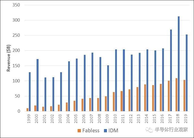 如下图所示,全球半导体行业的无晶圆厂部门已从1999年占整个行业的7%增长到2019年的30%。那就意味着有13%的复合年增长率,但IDM部门的复合年增长率仅为4%。从下图可以看到,市场上IDM部分的波动性也明显更高。这主要是由于存储设备的巨大收入贡献以及这些产品的价格波动所致,这种波动是由于竞争者寻求产生现金以抵消维持工厂所需的巨额资本支出而导致的供应不足和供应过剩的频繁循环所导致的。