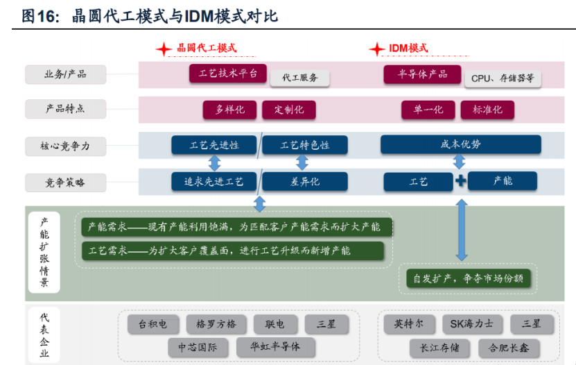 1.晶圆代工厂。代工模式的核心在于“服务”,晶圆代工厂通常提供一个工艺技术平台,根据客户需求提供客制化产品与服务,发展壮大的关键在于覆盖更多的客户、满足客户更多的需求,因而晶圆代工厂的扩厂也是为了匹配客户需求、通常是顺应市场需求发展趋势的。当市场需求旺盛时,积极的资本开支以满足日益增长的下游需求,也是公司未来成长的动力。面向客户需求,晶圆代工厂的产能扩张情景主要有2类:(1)产能需求。即现有产能利用饱满,为匹配客户产能需求而扩大产能。(2)工艺需求。即为满足客户更多需求或者扩大客户覆盖面,进行工艺升级而新增产能。