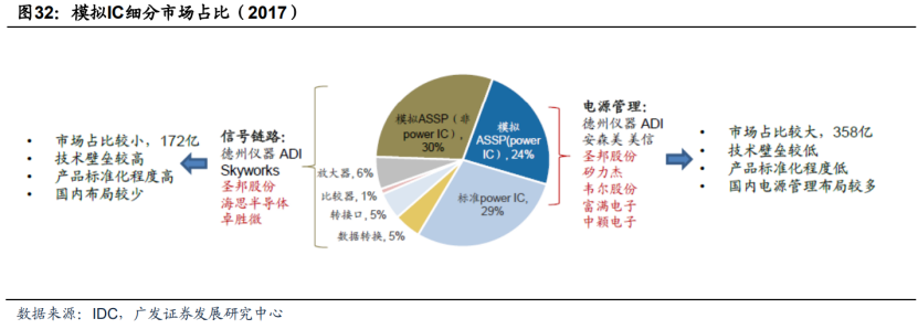 根据IDC数据,2017年电源管理芯片占模拟芯片的53%左右(包括标准power IC和模拟ASSP用途的power IC),电源管理用途在家电、工业用途相对较为成熟,技术更新迭代较慢,技术壁垒相对较低,国内布局厂商较多,包括圣邦股份、矽力杰、韦尔股份、富满电子、中颖电子等。信号链路芯片可细分为非power IC的模拟ASSP、放大器、比较器、数据转换芯片等,根据IDC数据,2017年信号链路芯片占模拟芯片的47%,国内布局厂商较少,以华为海思、圣邦股份为主。