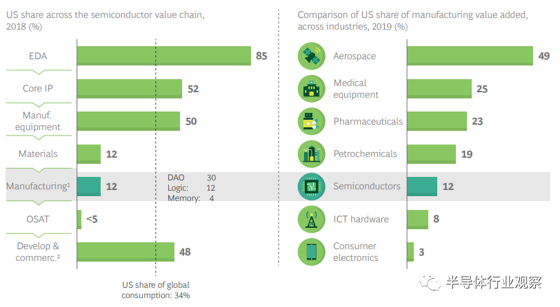 资料来源:半导体价值链来源于Gartner,半导体工业协会(SIA),VLSI研究,SEMI和公司财务的市场数据进行的BCG分析;美国占制造业附加值的份额来源于牛津经济研究院对宏观经济数据的BCG分析。
