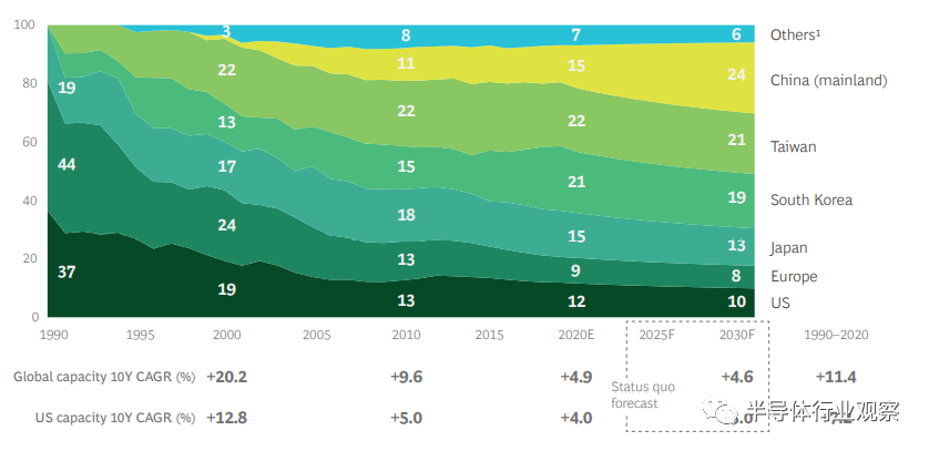 由于半导体对技术领先地位和国家安全的战略意义,许多国家现在更为关注其在半导体价值链中的地位。美国一直是半导体领域的全球领导者,在过去30年中,美国在全球半导体行业收入中所占份额为45%至50%。但是当前美国在半导体制造领域的份额正在下降,仅占全球装机容量的12%。