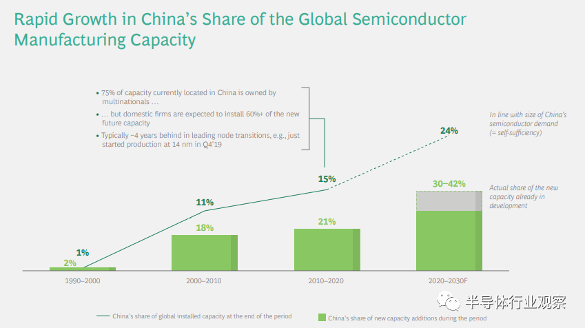 与美国相反,长期以来,半导体制造一直是中国的当务之急,中国近年来也一直在加快实现目标。如下图所示,中国在全球半导体制造能力中所占份额的快速增长。
