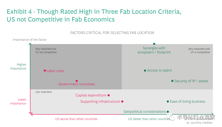 那么,为什么公司选择在美国境外建造晶圆厂呢?我们根据半导体行业的相关经验,与行业领导者进行的讨论,以及对参与制造的美国半导体公司的调查来确定:公司决定在何处建立新晶圆厂的关键标准,以及将美国与其他替代地点进行比较所得到的相对位置。(参见图4)