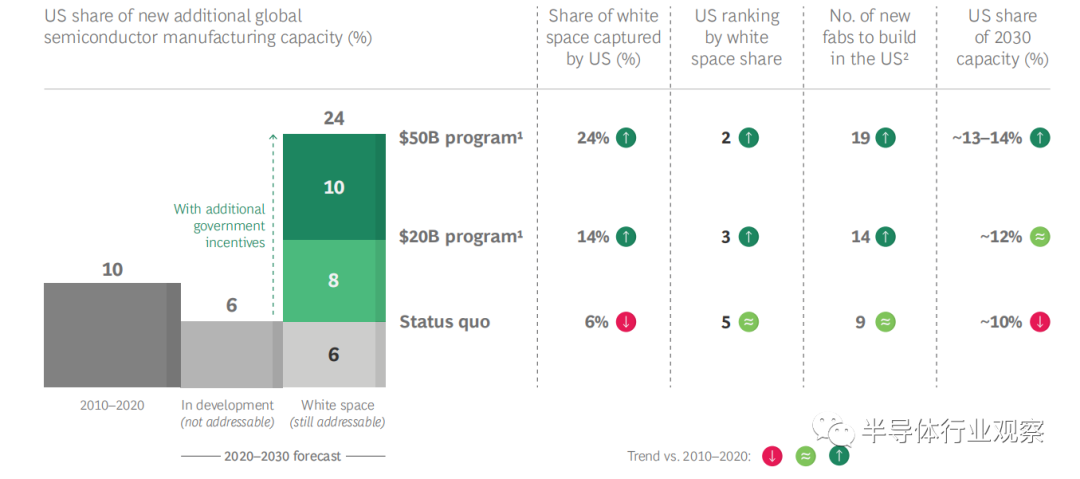 鉴于2020年至2030年全球产能预计将强劲增长,以满足半导体需求的增长,未来十年为美国提供了一个止跌甚至可能扩大制造份额的市场机会。在选择工厂所在地的一些关键标准上,美国已经具备相对优势,如与现有版图和生态系统的协同效应、技术人才、知识产权保护等,但在成本上却没有竞争力。虽然本报告的目的不是提供政策建议,但我们的分析表明,扩大目前有限的州级政府激励措施,并在十年内制定一个新的目标为200亿~500亿美元的联邦计划,可以使美国的激励措施与台湾、韩国或新加坡的激励措施相一致,并重新确立美国是先进半导体制造的最有吸引力的国家的地位。