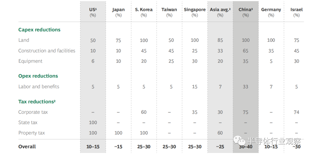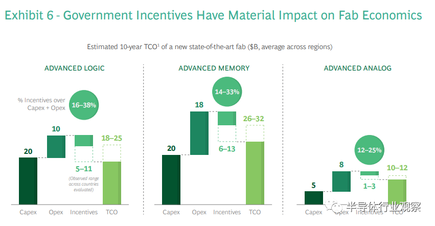 考虑到这些成本,政府提供的激励措施对于需要支持的投资方至关重要,并且这种激励措施已成为新晶圆厂投资业务案例的常规部分。政府激励措施通常会减少土地,建筑和设备上的前期资本支出,但也可以扩展到经常性运营支出,例如人工成本。总体而言,根据国家/地区的不同,我们估计政府的激励措施可以抵消新工厂总TCO的15%至40%(扣除激励措施之前)。