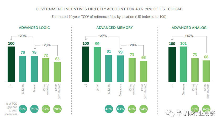 为了量化美国与其他地区之间的成本差异,我们对三种代表性类型的晶圆厂在十年内的总拥有成本(TCO)