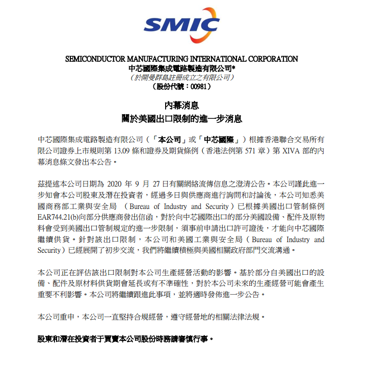 “经过多日与供货商进行询问和讨论后,本公司知悉美国商务部工业与安全局 (Bureau of Industry and Security)已根据美国出口管制条例EAR744.21(b)向部分供货商发出信函,对于向中芯国际出口的部分美国设备、配件及原物料会受到美国出口管制规定的进一步限制,须事前申请出口许可证后,才能向中芯国际继续供货。”
