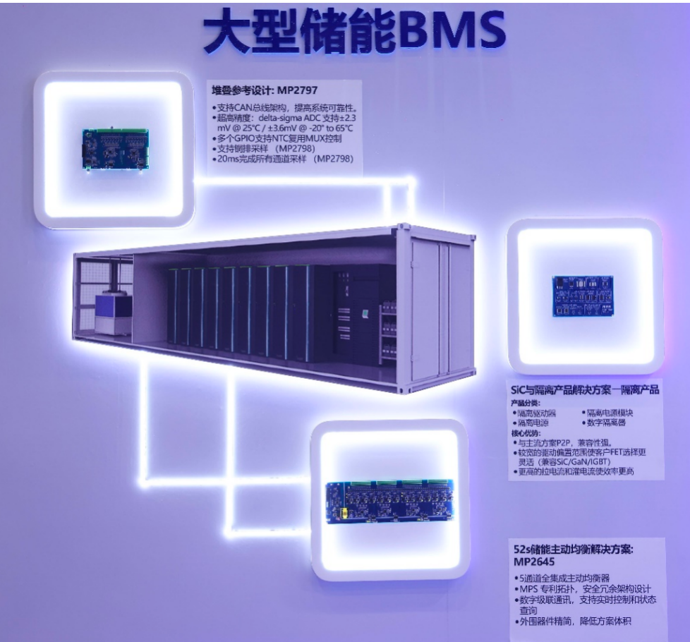 随着光伏、风电等新能源快速发展,大型储能系统在电网侧的应用日益重要,其主要作用是为新能源接入提供缓冲,提升电网稳定性。针对大型储能系统,MPS展示了基于MP2797和MP2645的两套关键解决方案,满足高串数、高功率储能系统的工程化需求。