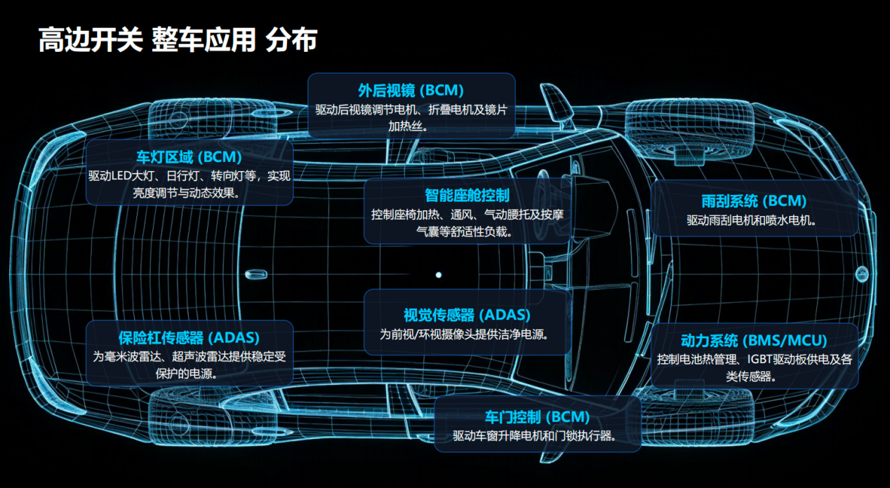 在整车应用中,高边开关已经广泛进入车身控制器(BCM)、灯光、雨刮、车门、座椅、外后视镜以及ADAS传感器供电等场景,并进一步向BMS、动力相关辅助供电和智能配电盒等位置延伸;而E-fuse则更多承担高电流、高可靠、高安全要求下的主动保护功能,在PDU、OBC、DC-DC以及电池包相关系统中具备应用空间。