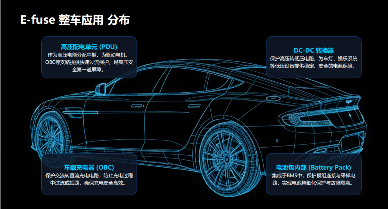 在E-fuse领域,从高压配电单元(PDU)、车载充电机(OBC)到DC-DC转换器及电池包内部保护,E-fuse正在承担整车电力系统的“第一道安全屏障”,并逐步取代传统保险丝与断路器,成为电力系统中的主动控制单元。