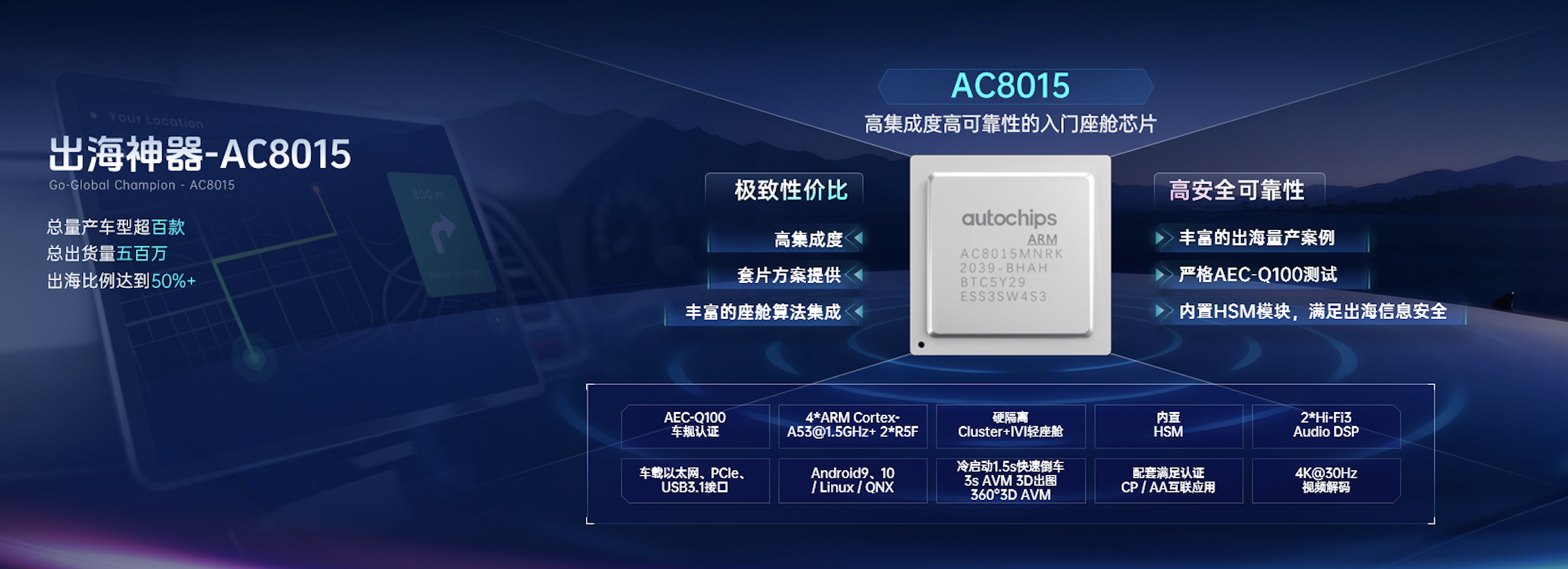 谈到具体的产品,程鹏首先介绍到,AC8015是公司的明星产品——2017年立项、2020年量产、2023年迎来爆发。“它原来卖得平平,但随着国产车出海,这颗芯片成了客户口中的‘出海神器’。”程鹏表示。AC8015支持多系统运行,可同时驱动中控与仪表,实现多屏交互,被广泛应用于国产品牌的出口车型中。“现在,出海的国产车里,差不多一半装了8015。”程鹏进一步指出。